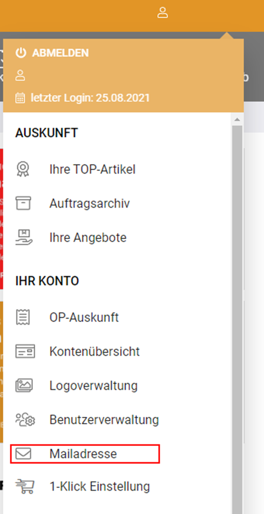 Klicken Sie oben rechts auf Ihren Firmennamen. Unter der Kategorie „Einstellungen“ finden Sie die Rubrik „Mailadresse“.