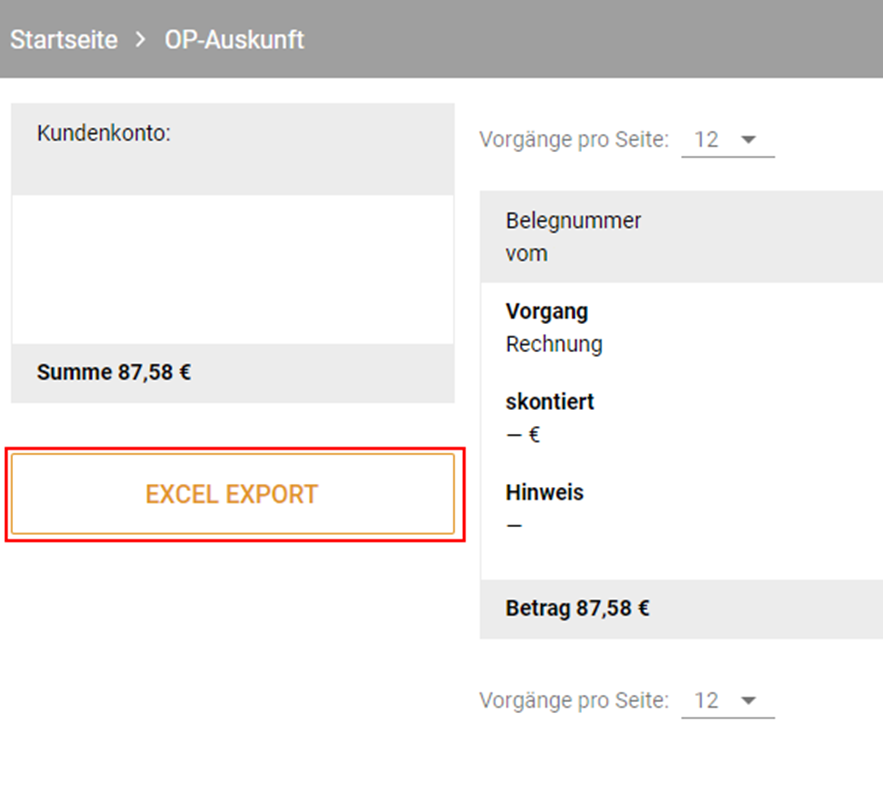 - Wählen Sie nun die gewünschte Bestellung aus und klicken Sie auf der linken Seite auf den Button „Excel Export“
