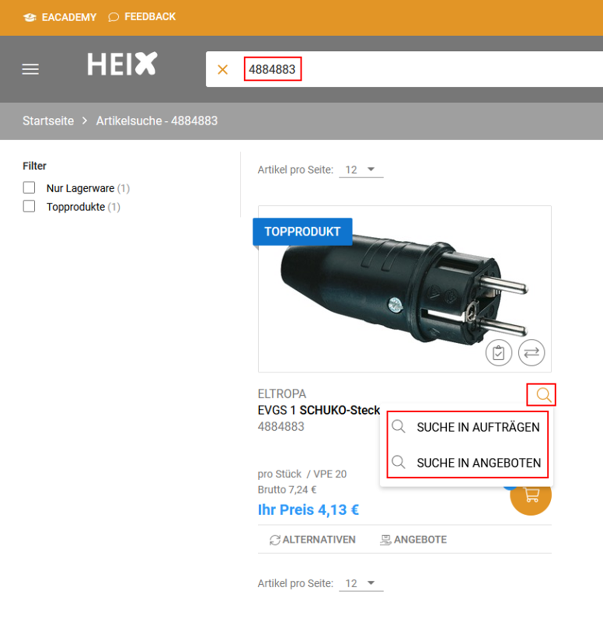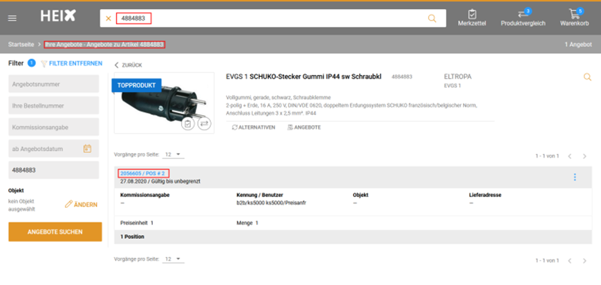 Sie werden automatisch in "Ihre Angebote" weitergeleitet. HEIXonline zeigt Ihnen jetzt die Angebote an, wo der gewünschte Artikel enthalten ist.