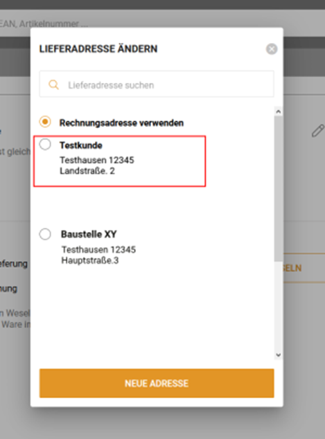 Klicken Sie auf "ändern". Es öffnet sich ein weiteres Fenster, wo Ihnen alle Lieferadressen angezeigt werden, die fest bei uns hinterlegt sind. Wählen Sie nun Ihre gewünschte Lieferadresse aus: