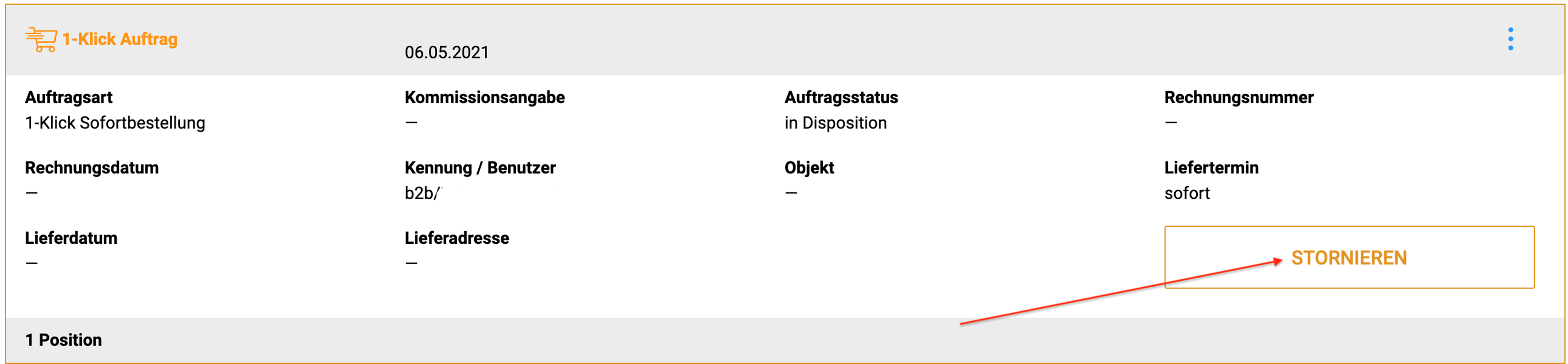 Um eine Onlinebestellung zu stornieren, nehmen Sie bitte Kontakt mit Ihrem zuständigen Innendienst oder dem entsprechenden Außendienst auf.