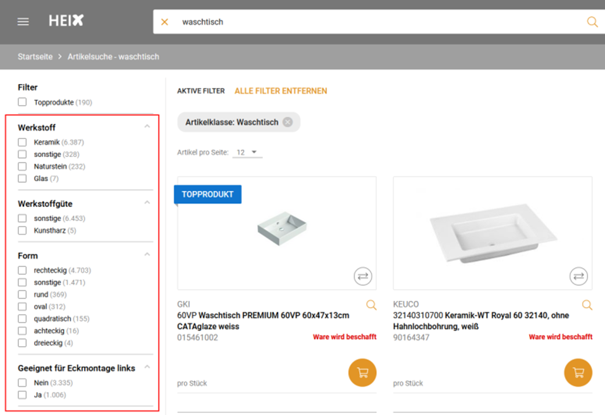 Geben Sie in der Suche Ihren Suchbegriff ein. Auf der linken Seite haben Sie jetzt die Möglichkeit die gewünschte Artikelklasse zu wählen. Haben Sie eine Artikelklasse ausgewählt, können Sie weitere Filterungen vornehmen.