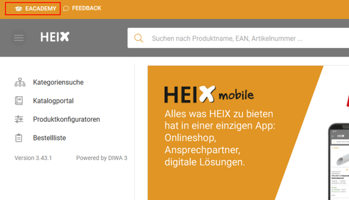 Über HEIXonline gelangen Sie auch zur eAcademy. Klicken Sie einfach auf das Logo oben links neben dem Feedback Symbol.