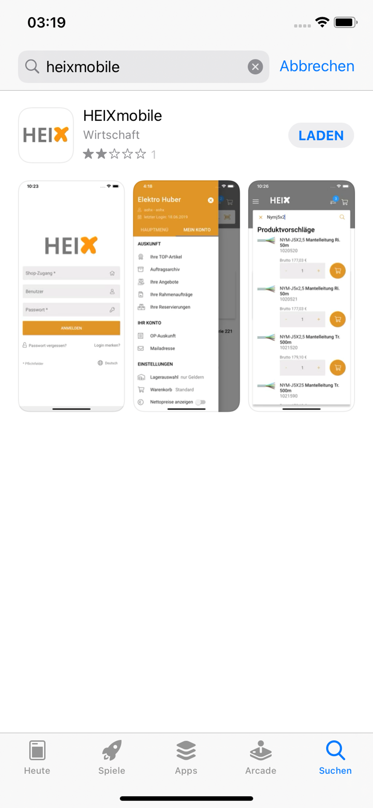 Diese wählen Sie bitte aus und geben oben in der Suchleiste „HEIXmobile“ ein. (Groß und Kleinschreibung hat keine Auswirkung auf die Suche). Wird Ihnen das HEIX Logo angezeigt können Sie sicher gehen, dass sie die richtige App gefunden haben. Jetzt klicken Sie auf der rechten Seite auf