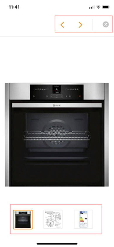 Jetzt öffnet sich ein neues Fenster mit den Bildern zum Produkt. Auf die weiteren Bilder gelangen Sie entweder über die kleinen Vorschaubilder unter dem großen Bild, oder über die orangen Pfeile rechts oben. Das Fenster können Sie über das „x“ rechts oben wieder schließen.