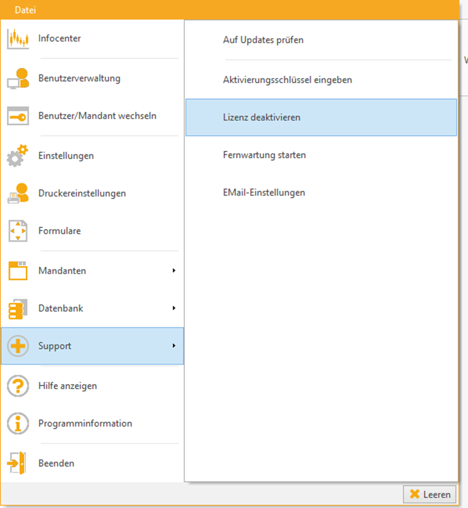 Klicken Sie auf: Datei --> Support --> Lizenz deaktivieren