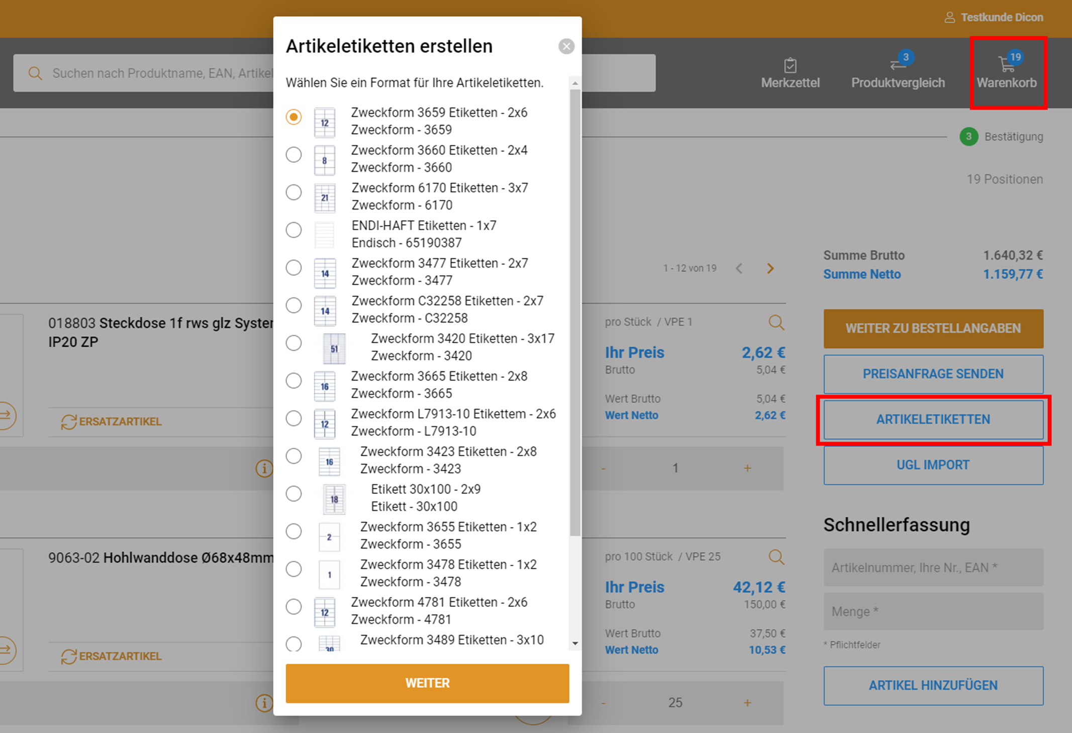 Warenkorb --> Artikeletiketten
