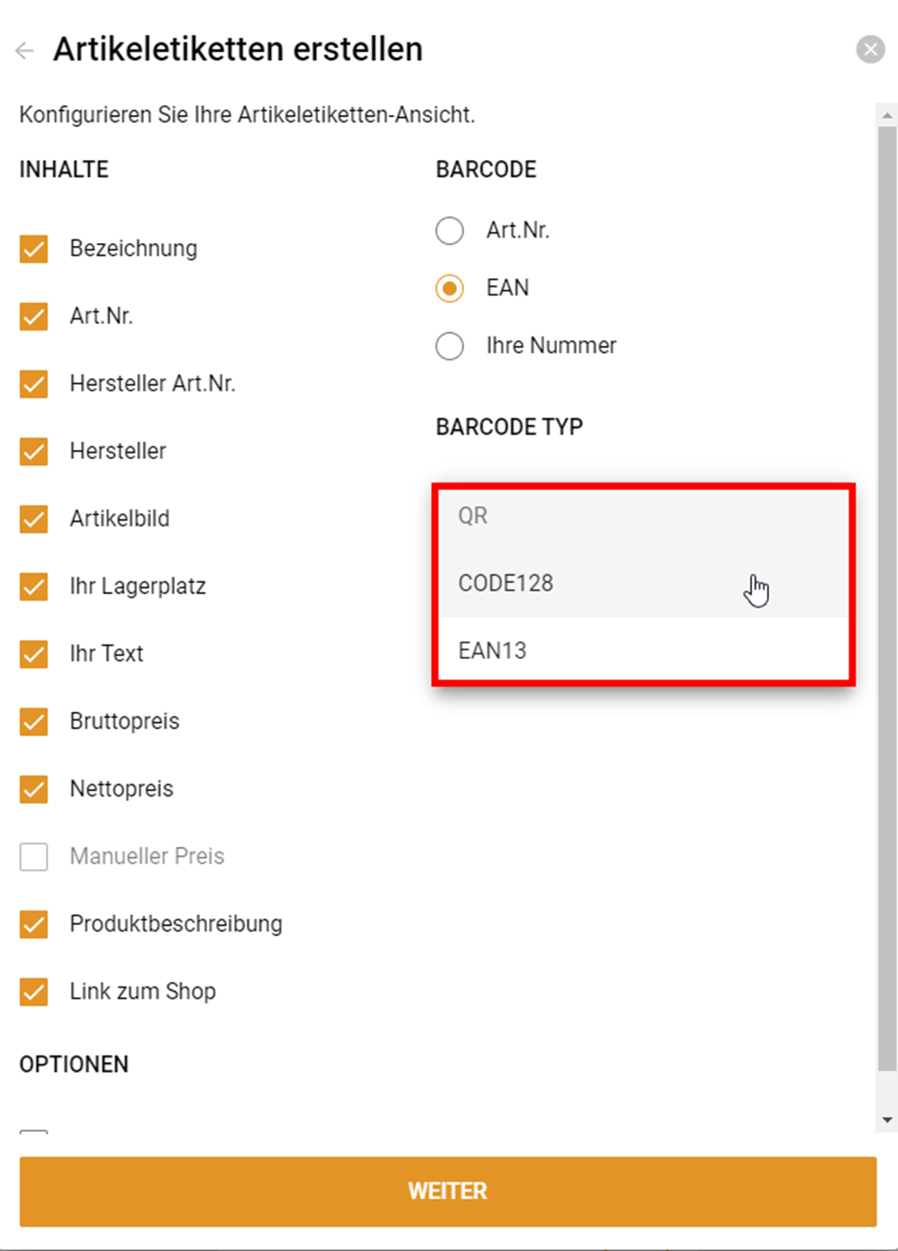 Konfigurieren Sie anschließend Ihre individuellen Etiketten nach den folgenden Inhalten und wählen Sie ihren gewünschten Barcode Typ.