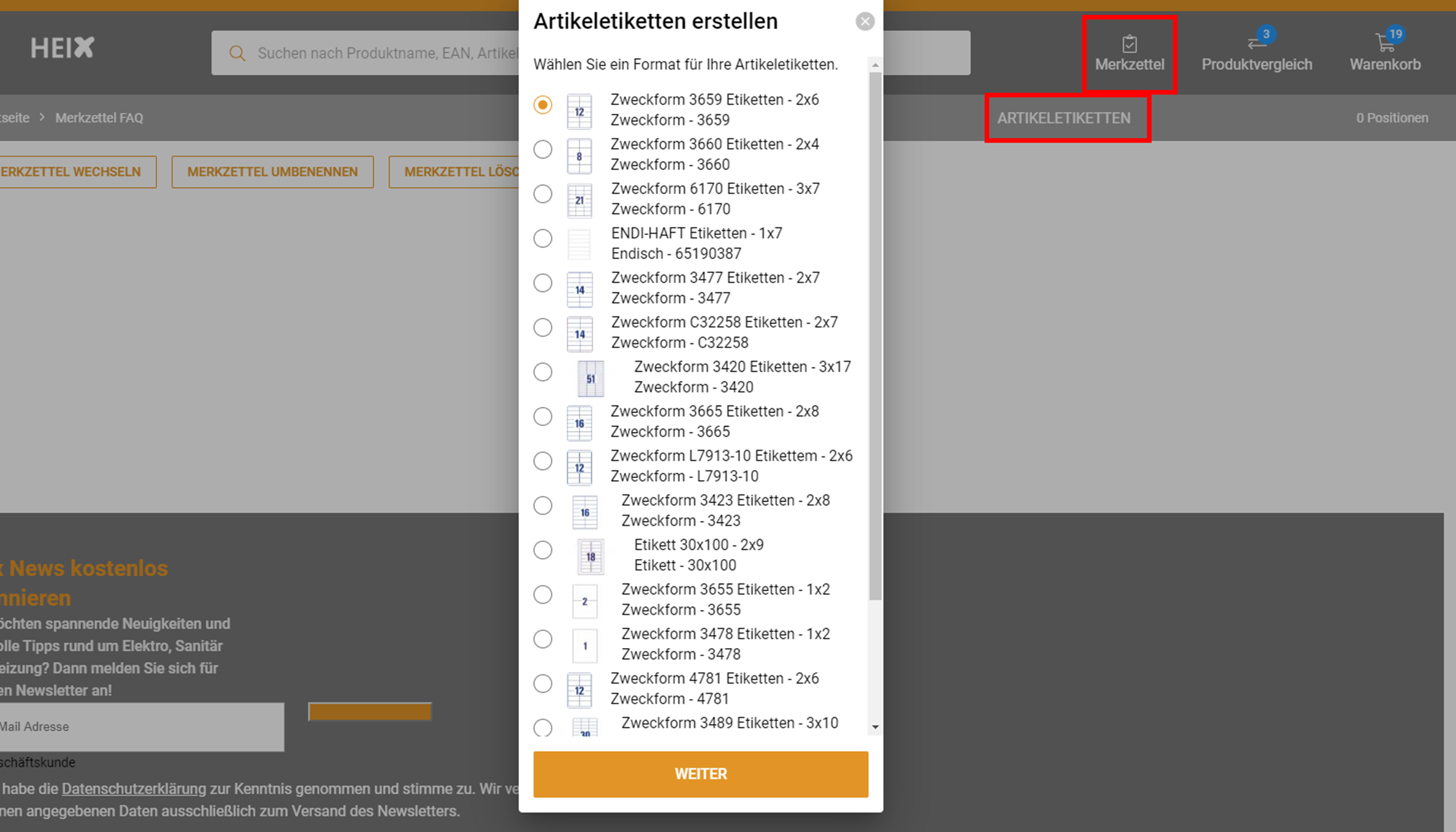 Die Funktion - Artikeletiketten - können sie aus Ihrem Warenkorb und auch auch Ihrer Merkliste nutzen. Hierbei haben Sie die Wahl, aus mehreren vorhandenen Vorlagen passende Etiketten für Ihre Artikel zu erstellen.