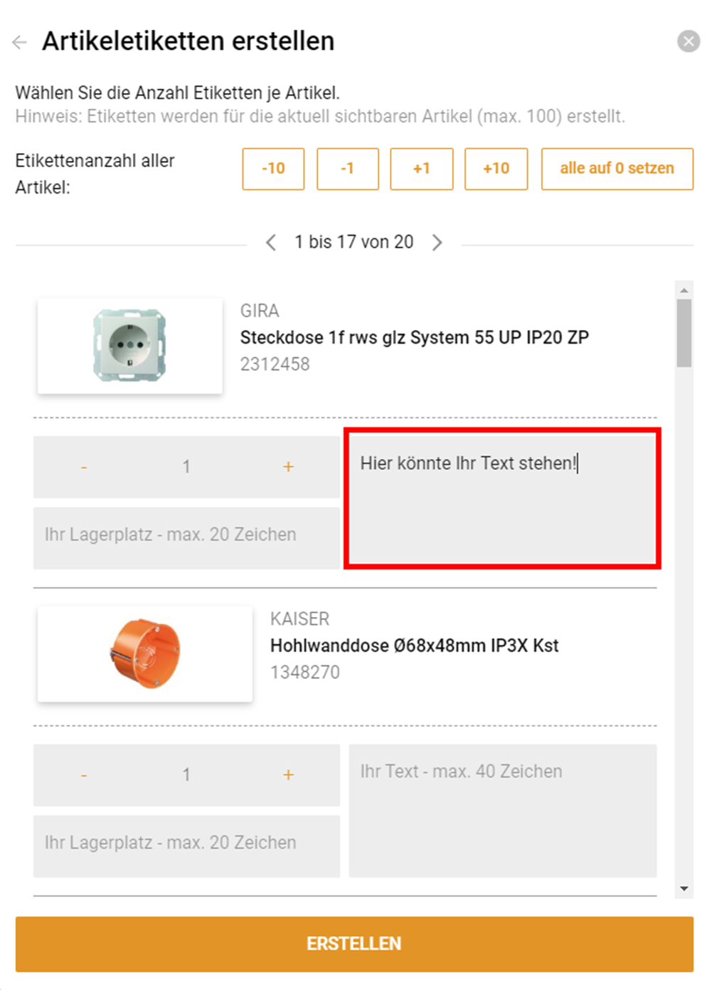 Einige der Artikeletiketten können Sie ebenfalls mit manuellen Texten versehen. Bitte achten Sie hierbei auf die Maximalanzahl der Artikelzeichen.