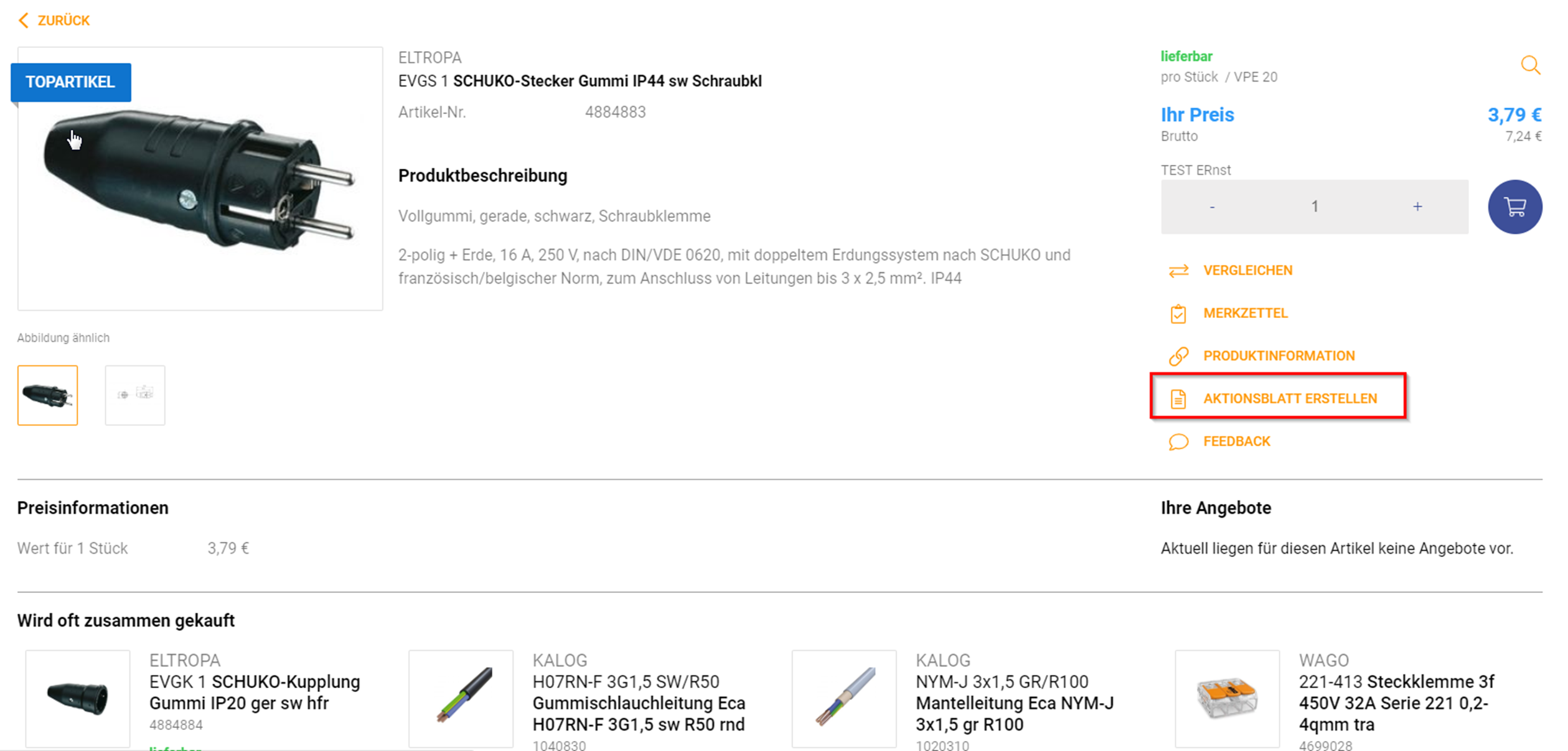 Falls Sie ausführlichere Produktunterlagen zu einzelnen Produkten erstellen möchten können Sie ebenfalls die Funktion AKTIONSBLATT ERSTELLEN in der Artikleldetailansicht nutzen.