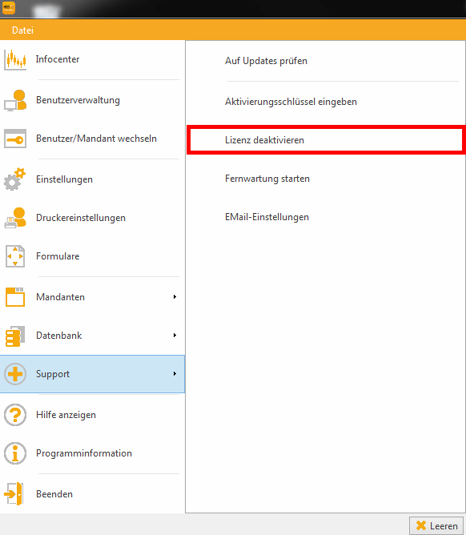 Ihre Lizenz können Sie im Programm deaktivieren unter: Datei > Support > Lizenz deaktivieren