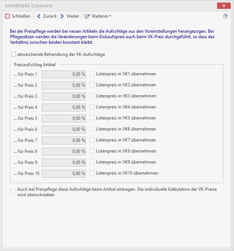 Möglichkeit 1: Beim Import Ihrer Datanormdaten haben Sie die Möglichkeit, nach Auswahl Ihres Lieferanten, für Ihre Verkaufspreise einen individuellen Aufschlag zu erheben.